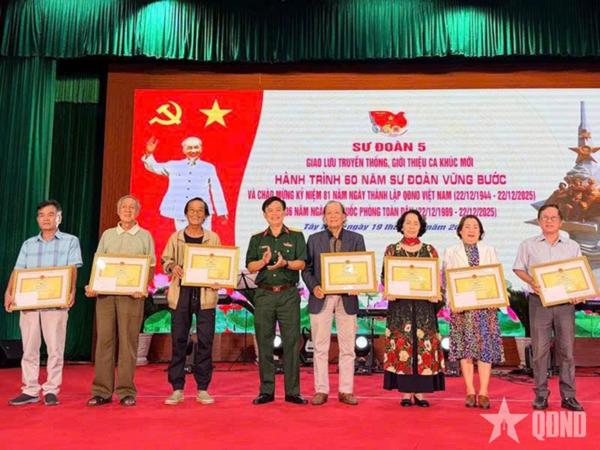 Ngày 19-12, Sư đoàn 5 (Quân khu 7) tổ chức chương trình giao lưu truyền thống, giới thiệu ca khúc mới về Sư đoàn nhân kỷ niệm 81 năm Ngày thành lập Quân đội nhân dân Việt Nam (22-12-1944 / 22-12-2025). Chương trình tổ chức với nội dung phong phú, thiết thực: Thông tin chuyên đề về tình hình thời sự và giao lưu văn nghệ giới thiệu các ca khúc về Sư đoàn do Hội Nhạc sĩ Việt Nam sáng tác gửi tặng Sư đoàn 5.