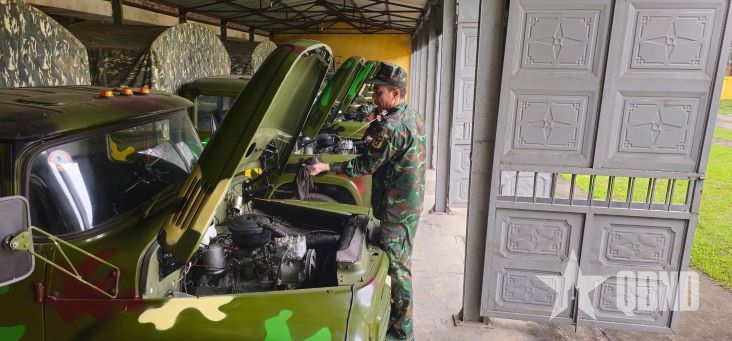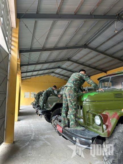 | Kiểm tra kỹ thuật xe quân sự tại nhà xe đơn vị. |