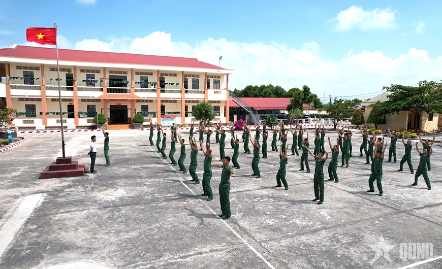 Giờ học các bài thể dục sáng của chiến sĩ mới tại Tiểu đoàn 1, Trung đoàn 894, Bộ CHQS tỉnh Cà Mau.