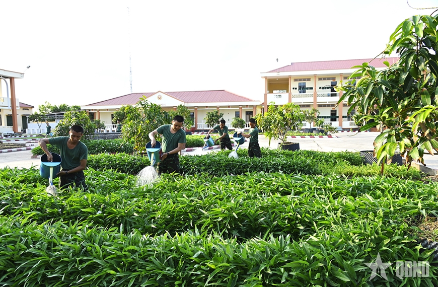 Chiến sĩ mới Đại đội 2, Tiểu đoàn 1, Trung đoàn 894 chăm sóc vườn rau xanh sau giờ nghỉ.