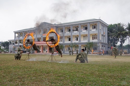 Các chiến đấu viên luyện tập phi thân qua vòng lửa.