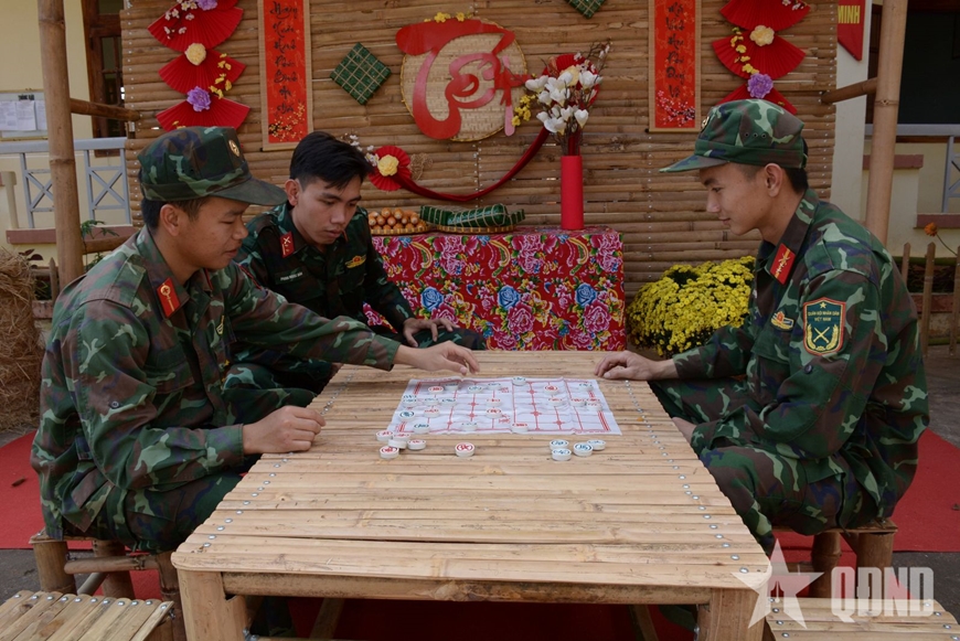 | Chiều về, cán bộ, chiến sĩ các trung đội thường quây quần đánh cờ, đọc báo trước những gian hàng, khu vực check in mang đậm sắc màu ngày Tết. |