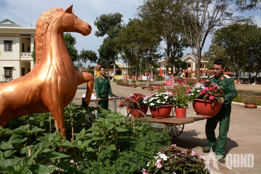 Những ngày cuối tháng Chạp, trong tiết trời xuân ấm áp, cán bộ, chiến sĩ Tiểu đoàn 303 (Trung đoàn 584, Bộ CHQS tỉnh Đắk Lắk) tất bật củng cố cảnh quan, trang hoàng doanh trại, đón chào năm mới Bính Ngọ 2026.