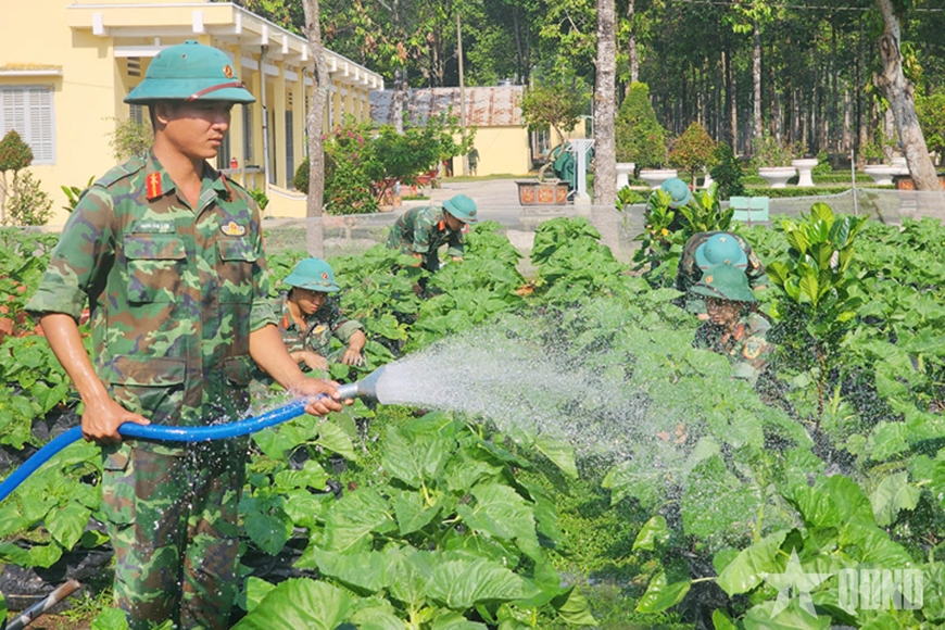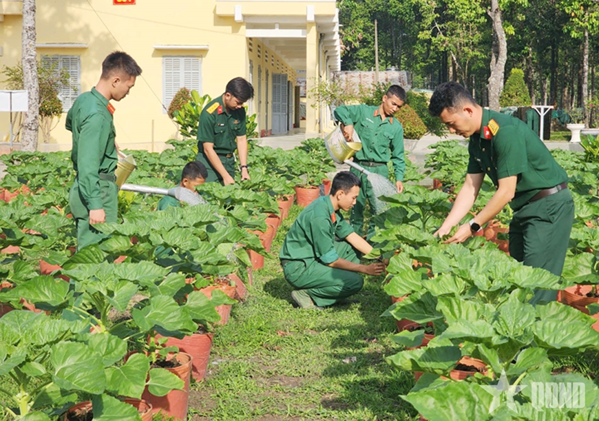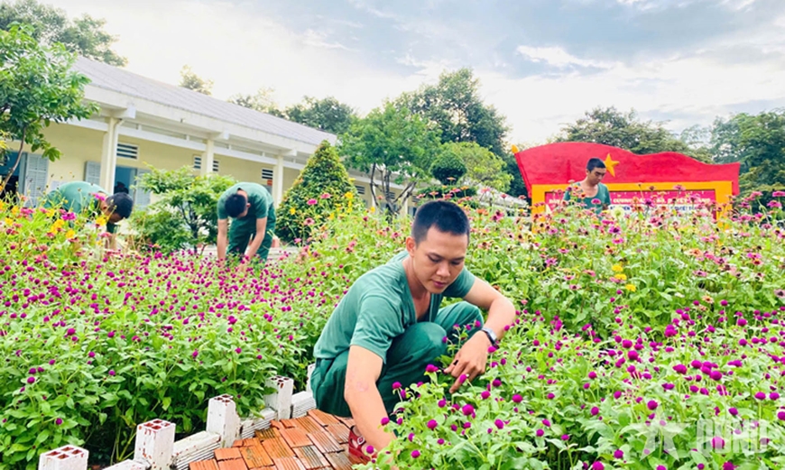 Tại vườn hoa của Tiểu đoàn 5, Trung đoàn 2 (Sư đoàn 9), Đại úy Phan Sơn Điền, Chính trị viên Đại đội 7 (Tiểu đoàn 5) đang cùng chiến sĩ tỉ mỉ nhổ cỏ, tỉa lá, vun đất cho những khóm cúc vàng. Anh Điền chia sẻ: “Ban đầu, một số chiến sĩ còn ngại và chưa quen với việc trồng hoa, chăm cây. Nhưng sau vài tuần, khi thấy cây lớn lên từng ngày, ai cũng hào hứng. Có đồng chí còn tranh thủ giờ nghỉ ra thăm vườn, xem hôm nay hoa đã nhú nụ chưa”.