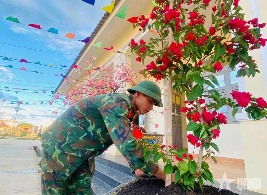 | Chiến sĩ Trung đoàn 24, Sư đoàn 10 chăm sóc cây cảnh đón Tết. |