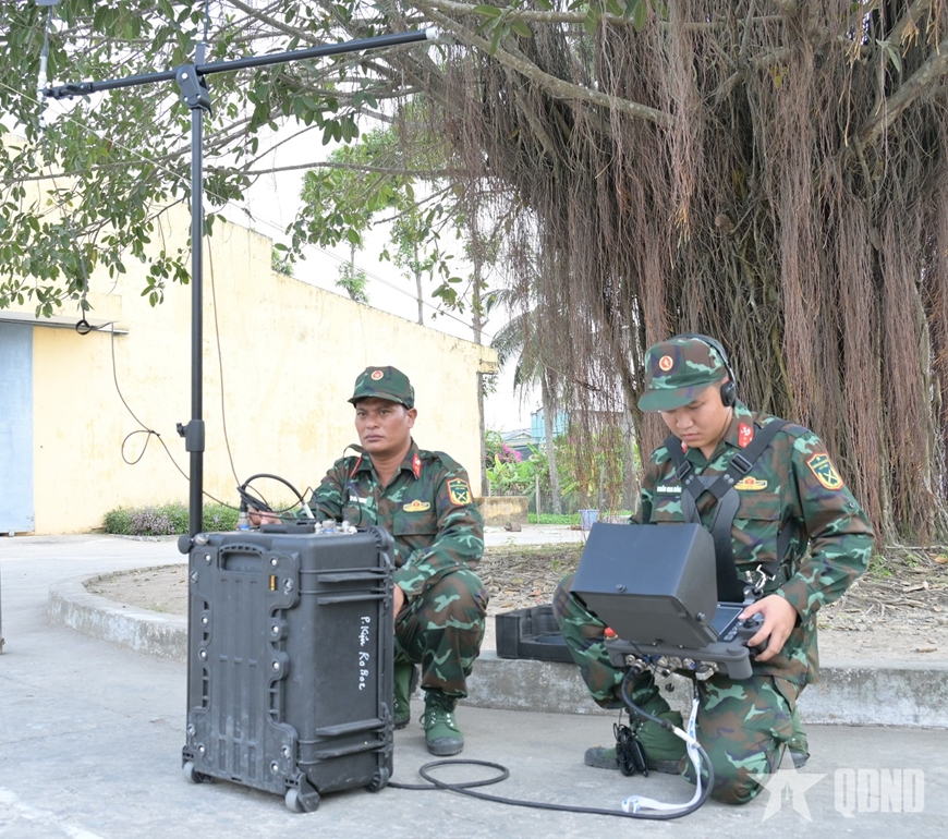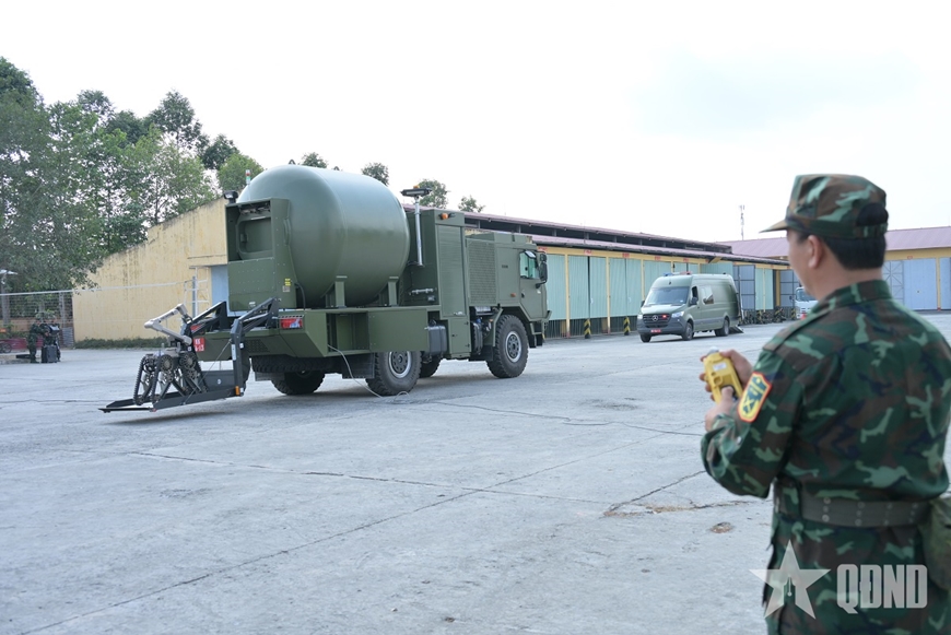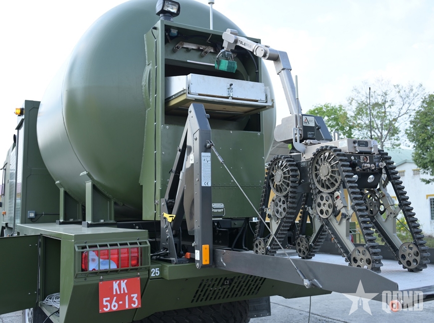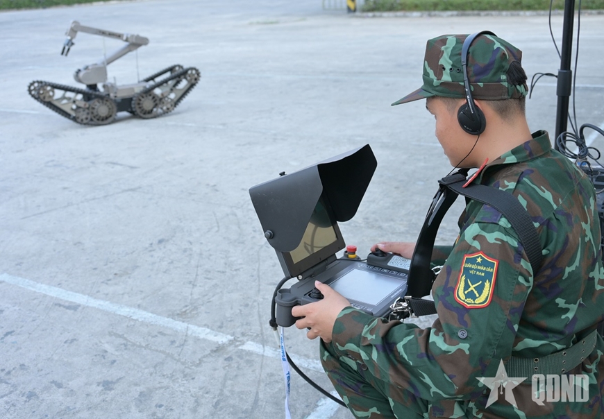 | Trung úy Trần Gia Bảo, Trung đội trưởng Trung đội 3, Tiểu đoàn Vượt sông 4, Lữ đoàn Công binh 25 điều khiển robot xử lý vật khả nghi. |
