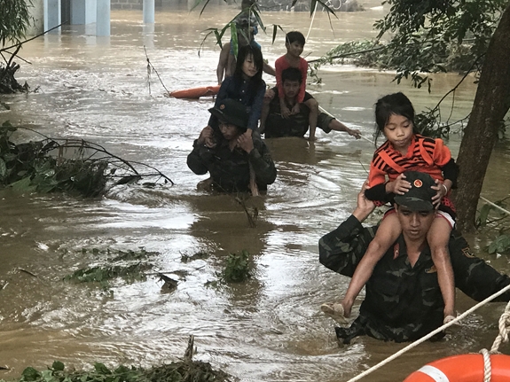Cán bộ, chiến sĩ Sư đoàn 316 đưa người dân đến nơi an toàn sau mưa lũ tại huyện Mù Cang Chải (Yên Bái) năm 2018.