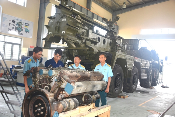 Cán bộ kỹ thuật Nhà máy A31 kiểm tra nhân viên kỹ thuật sửa chữa động cơ xe khí tài tên lửa phòng không. |