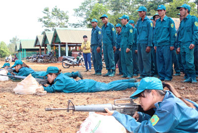 QĐND - Trên thao trường Ea Yông, gần 100 chiến sĩ dân quân "sao vuông" thuộc Trung đội 1 và Trung đội 2 của Ban CHQS xã Ea Yông (huyện Krông Pắk, tỉnh Đắc Lắc) đang thục luyện các khoa mục quân sự như: Bắn súng AR15, ném lựu đạn xa trúng hướng, vận động trên chiến trường… Gần 15 ngày huấn luyện trong cái nắng cao điểm của mùa khô Tây Nguyên, ai nấy cũng đều có màu da sạm nắng. Với các nữ chiến sĩ dân quân như H’Phơ Niê AYun, H’Chiêm Niê, H’MeLi Niê hay H’Zôn AYun, thì đây là một sự thử thách lớn, bởi ngày thường họ là những bông hoa Pơ-lang xinh xắn, dịu dàng của núi rừng Tây Nguyên. Sau những ngày luyện tập trên thao trường, họ đã trở thành những chiến sĩ dân quân thực thụ. Nữ chiến sĩ H’Phơ Niê AYun tâm sự: “Dù khó khăn đến mấy, chúng em cũng quyết tâm thi đua giành điểm cao nhất trong môn bắn súng”.
