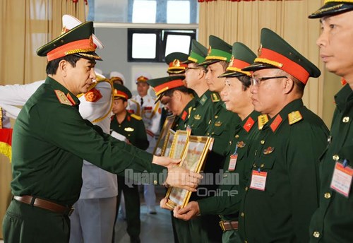 Trung tướng Phan Văn Giang trao thưởng cho các cán bộ hoàn thành xuất sắc trong đợt kiểm tra.