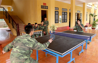| Chiến sĩ mới chơi bóng bàn trong giờ thể thao. |