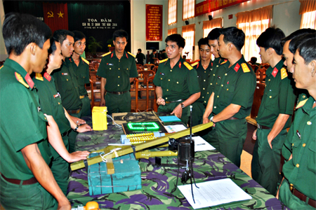 Sĩ quan trẻ Sư đoàn 330 (Quân khu 9) giới thiệu sáng kiến, cải tiến đồ dùng huấn luyện.