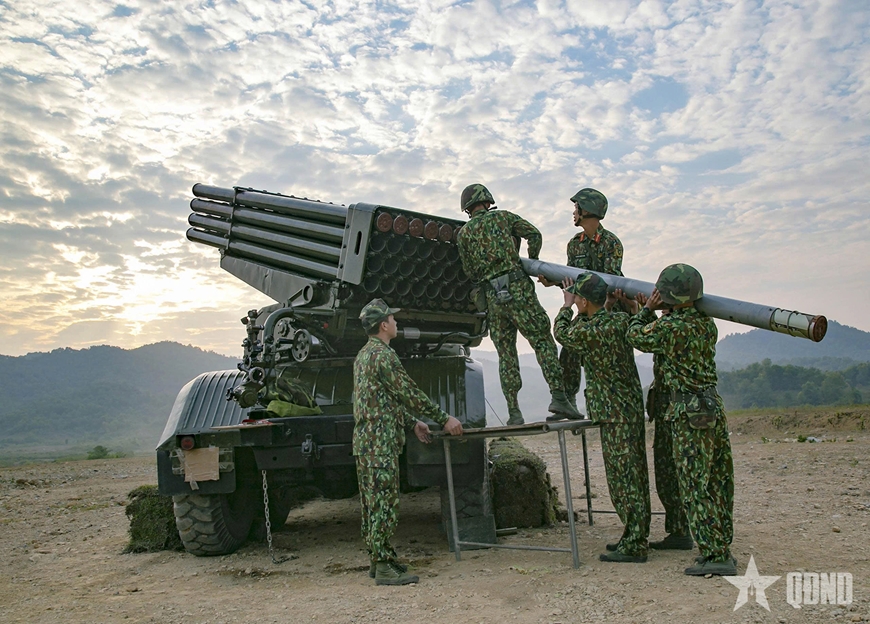 | Chiến sĩ pháo thủ Tiểu đoàn 3, Lữ đoàn Pháo binh 382 thao tác lắp đạn cho pháo BM-21. |