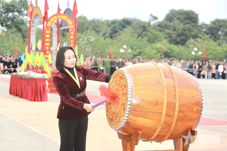 | Đại diện UBND phường Mộc Châu đánh trống hội giao quân. |