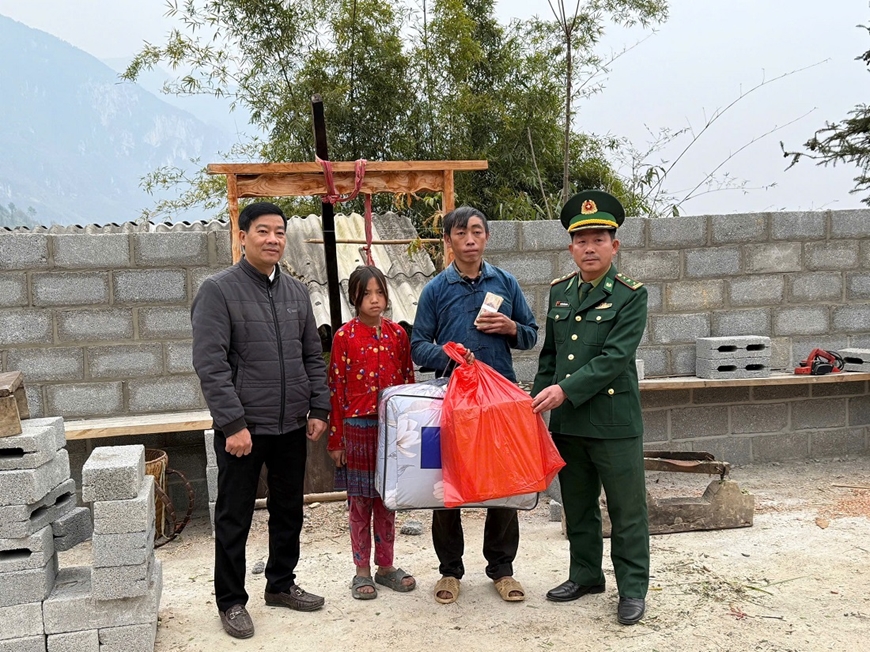 | Cán bộ, chiến sĩ Đồn Biên phòng Sơn Vĩ trao tiền và nhu yếu phẩm tặng nhân dân tại thôn Xéo Hồ, xã Sơn Vĩ theo chương trình xóa nhà tạm, nhà dột nát. |