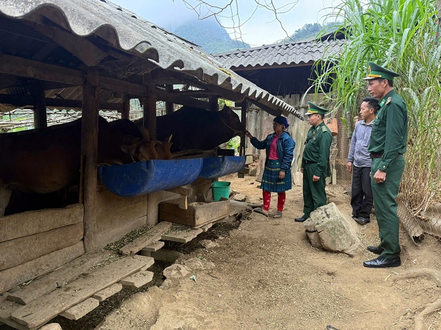 Cán bộ, chiến sĩ Đồn Biên phòng Sơn Vĩ hướng dẫn bà con kỹ thuật chăm sóc đàn gia súc.