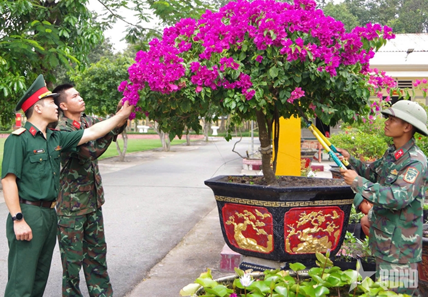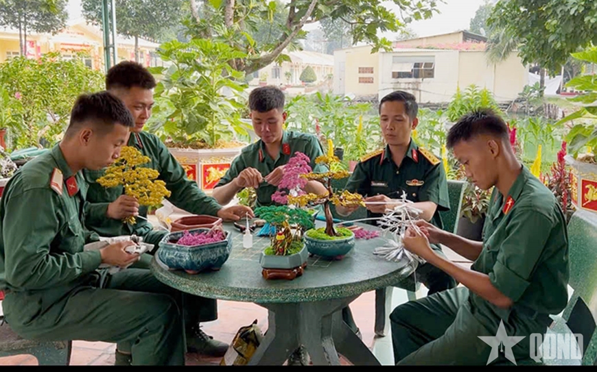 Bằng bàn tay khéo léo, óc sáng tạo của các “nghệ nhân chiến sĩ trẻ”, hàng nghìn chậu hoa giấy, cây cảnh, vườn hoa được cắt tỉa, uốn dáng tỉ mỉ, tạo nên những tác phẩm nghệ thuật và “góc xanh” rực rỡ quanh năm.
