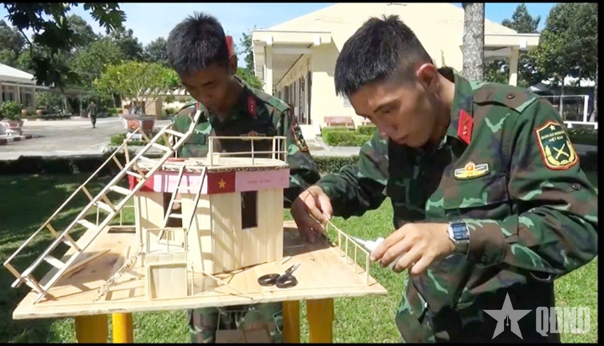 Chiến sĩ Sư đoàn 9 say mê sáng tạo làm mô hình Nhà giàn DK1 trong ngày nghỉ. |
