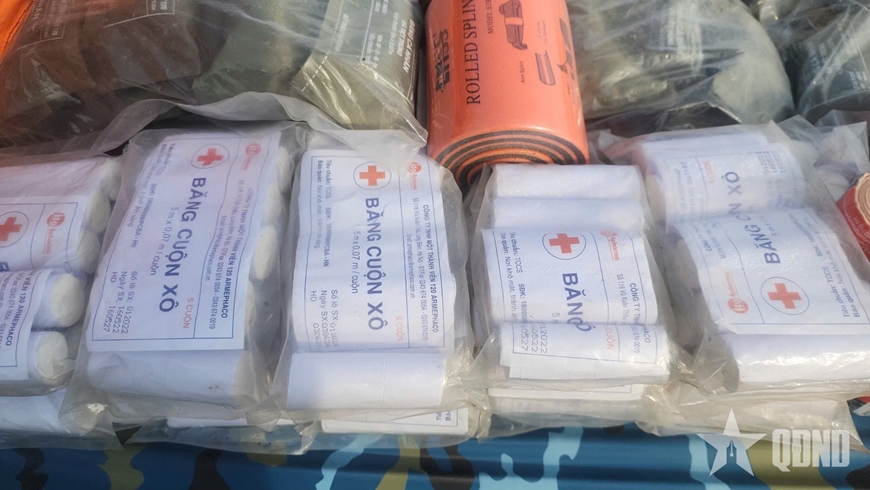 | Vật tư y tế, băng bó và dụng cụ sơ cứu được niêm phong, sắp xếp gọn gàng. |