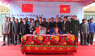 Ngày 24-12-2013, tại thôn Lao Chải (xã Y Tý, huyện Bát Xát, Lào Cai), Trưởng thôn Lao Chải và Trưởng thôn Địa Tây Bắc (Ma Ngan Tý, Kim Bình, Vân Nam, Trung Quốc) ký kết biên bản kết nghĩa. Ảnh: Trung Dũng