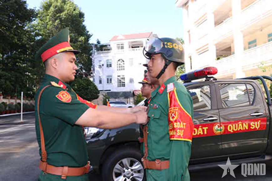 Cán bộ Tiểu đoàn 180 (Bộ Tham mưu Quân khu 7) kiểm tra tác phong chiến sĩ trước khi thực hiện nhiệm vụ kiểm soát quân sự.