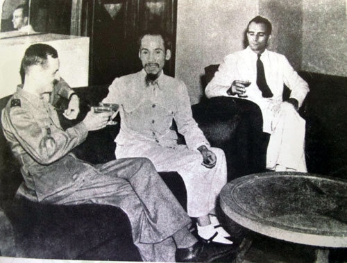 “Chủ tịch Hồ Chí Minh tiếp ông G.Xanhtơny – đại diện Chính phủ Pháp và tướng Lơcléc – Trưởng phái đoàn quân sự Pháp đến chào Người tại Bắc Bộ Phủ, tháng 3-1946”