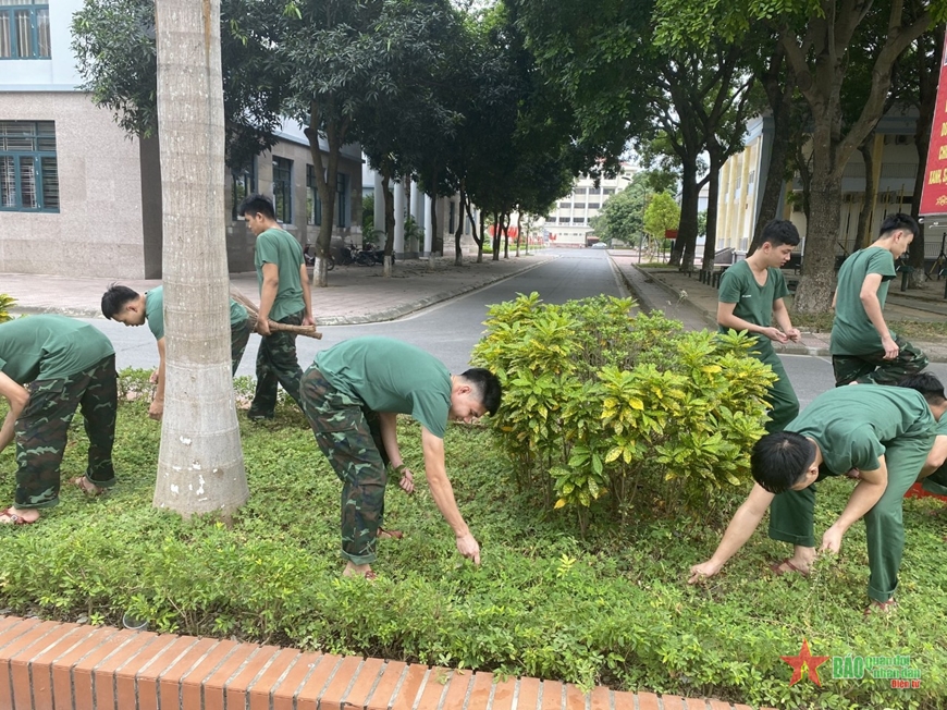 | Chiến sĩ Hệ 3 chăm sóc bồn hoa, cây cảnh. |