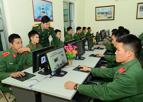 Học viên Trường Đại học Chính trị học tập, tra cứu tư liệu và đọc báo tại phòng đọc điện tử. Ảnh: Minh Trường