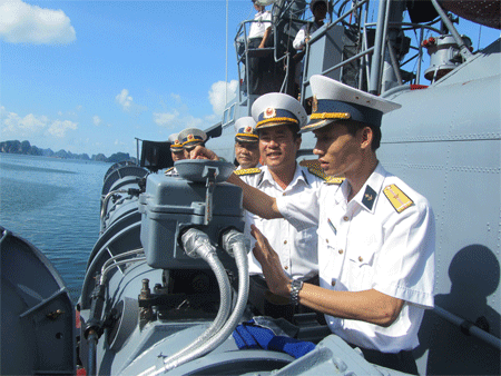 | Cán bộ chỉ huy Lữ đoàn 170 Hải quân kiểm tra công tác bảo quản vũ khí, khí tài trên tàu SSCĐ. Ảnh: Đình Xuân |
