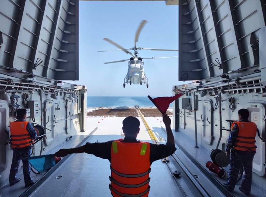 Huấn luyện cất, hạ cánh trực thăng trên Tàu 015-Trần Hưng Đạo, Lữ đoàn 162, Vùng 4 Hải quân. Ảnh: SƠN ANH