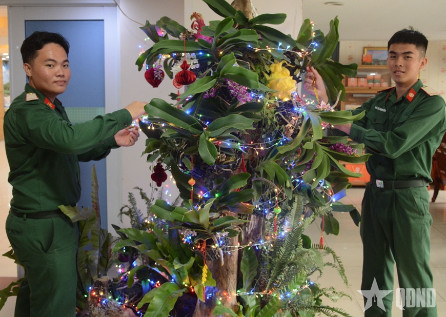 Sáng sớm 15-2 (tức sáng 28 tháng Chạp năm Ất Tỵ), có mặt tại Trạm khách T67 (Bộ Tham mưu Quân khu 7), chúng tôi chứng kiến cán bộ, nhân viên vẫn hối hả chỉnh trang làm cho doanh trại thêm sắc hoa Xuân. Cờ Đảng, cờ Tổ quốc được treo trang trọng; khu lễ tân, phòng nghỉ, nhà ăn được vệ sinh gọn sạch, thay mới hoa tươi. Một góc tiểu cảnh với mai vàng, bánh chưng xanh, dưa hấu đỏ được dựng lên ngay sảnh chính, tạo không gian ấm cúng cho khách đến chụp hình lưu niệm.