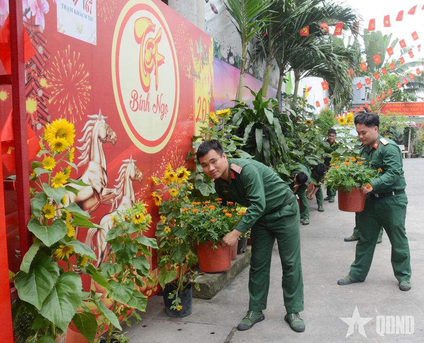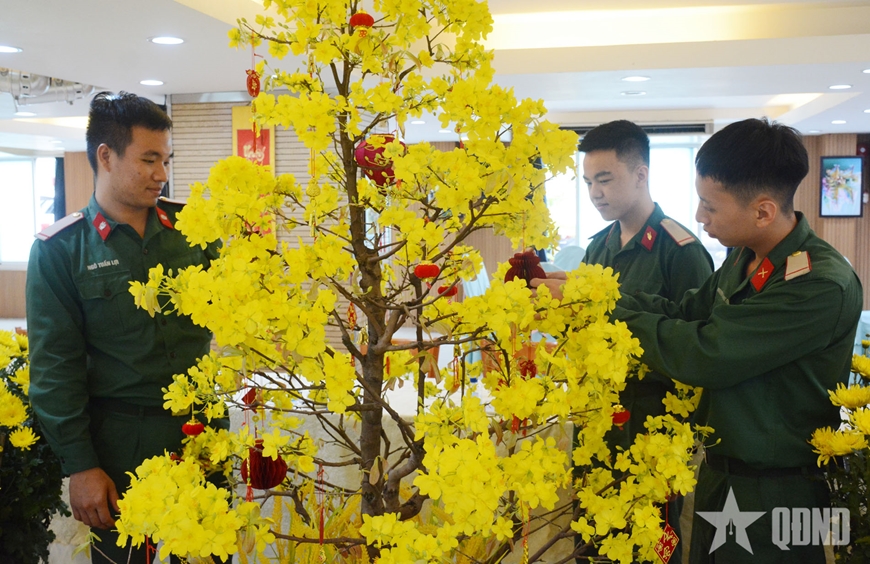 Ngay từ sáng sớm 15-2 (tức sáng 28 tháng Chạp năm Ất Tỵ), cán bộ, chiến sĩ, nhân viên Trạm khách T67 (Bộ Tham mưu Quân khu 7) hối hả chỉnh trang làm cho doanh trại thêm sắc hoa Xuân. Cờ Đảng, cờ Tổ quốc được treo trang trọng; khu lễ tân, phòng nghỉ, nhà ăn được vệ sinh gọn sạch, thay mới hoa tươi. Một góc tiểu cảnh với mai vàng, bánh chưng xanh, dưa hấu đỏ được dựng lên ngay sảnh chính, tạo không gian ấm áp cho khách đến chụp hình lưu niệm.