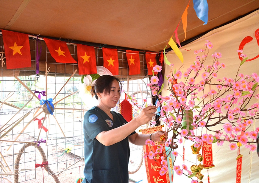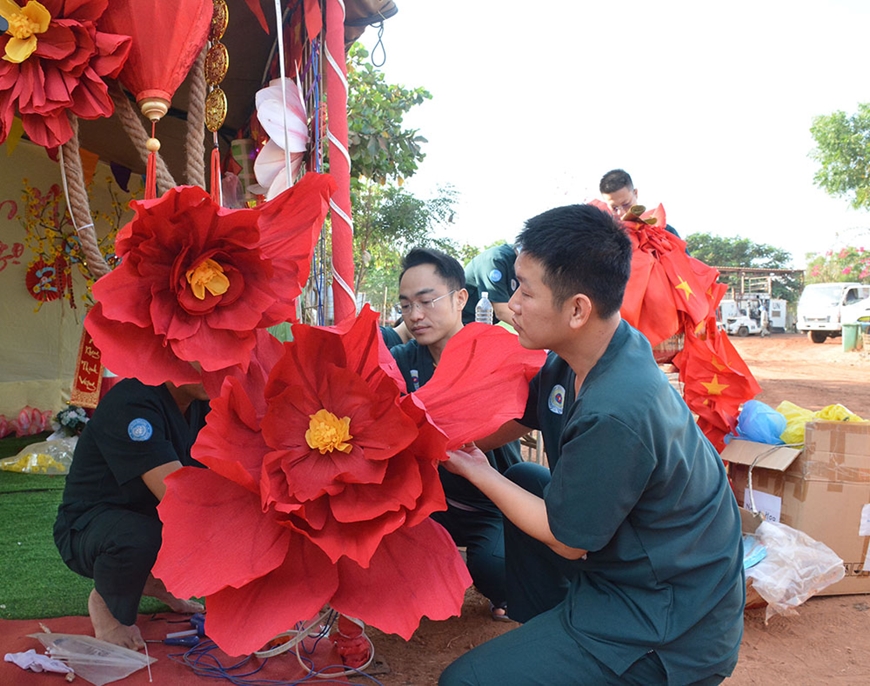 Những người lính “mũ nồi xanh” đã cùng dệt nên hình hài của Tết Việt giữa muôn trùng cát bụi và nắng gió nơi đất khách. “Ở đây, tuy có thể còn thiếu thốn nhiều thứ nhưng không thiếu tình cảm gia đình, không thiếu hồn cốt dân tộc. Bộ đội Cụ Hồ mình giỏi lắm, cả Việt Nam thu nhỏ còn mang sang đây được. Mọi người cùng nhau chuẩn bị mọi thứ để làm sao có một cái Tết xa quê nhưng ấm cúng, đủ đầy, vẹn tròn nhất”, Thiếu tá QNCN Nguyễn Thị Thanh Hằng, kỹ thuật viên phục hồi chức năng của Khoa Nội-Truyền nhiễm, BVDC 2.7 chia sẻ.