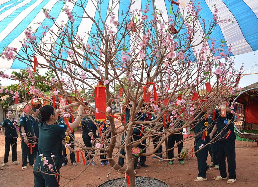 Gắn lời chúc lên cây đào bằng lụa tại Bệnh viện dã chiến cấp 2 số 7.