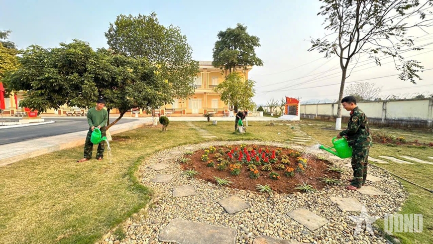 | Cán bộ, chiến sĩ Trung đoàn 832 tích cực củng cố cảnh quan môi trường chuẩn bị đón nhận chiến sĩ mới. |