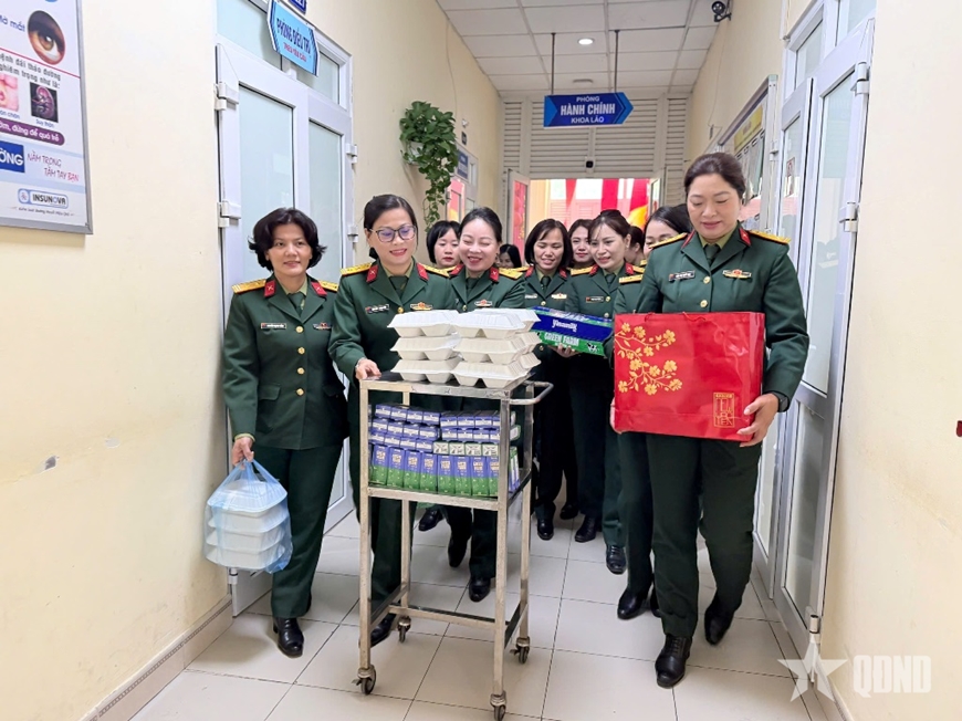 Phối hợp tổ chức thăm, tặng quà, phát cơm miễn phí tặng bệnh nhân nghèo tại Bệnh viện Đa khoa Đống Đa (Hà Nội). Ảnh do Phòng Công tác quần chúng, Cục Chính trị, Tổng cục Chính trị cung cấp
