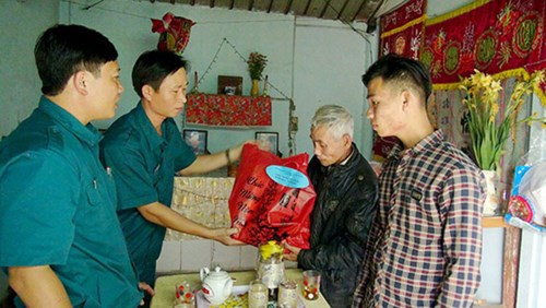 Đại diện Ban CHQS xã Hòa Nhơn, huyện Hòa Vang, tặng quà Tết cho gia đình anh Lê Duy Phước chuẩn bị nhập ngũ năm 2017. Ảnh: Hồng Hạnh.