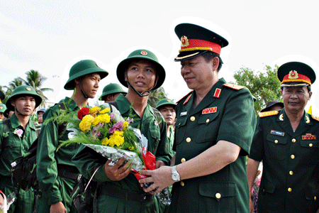 | Thiếu tướng Nguyễn Trọng Nghĩa, Phó Chủ nhiệm Tổng cục Chính trị động viên, chúc mừng thanh niên Tiền Giang lên đường nhập ngũ. |