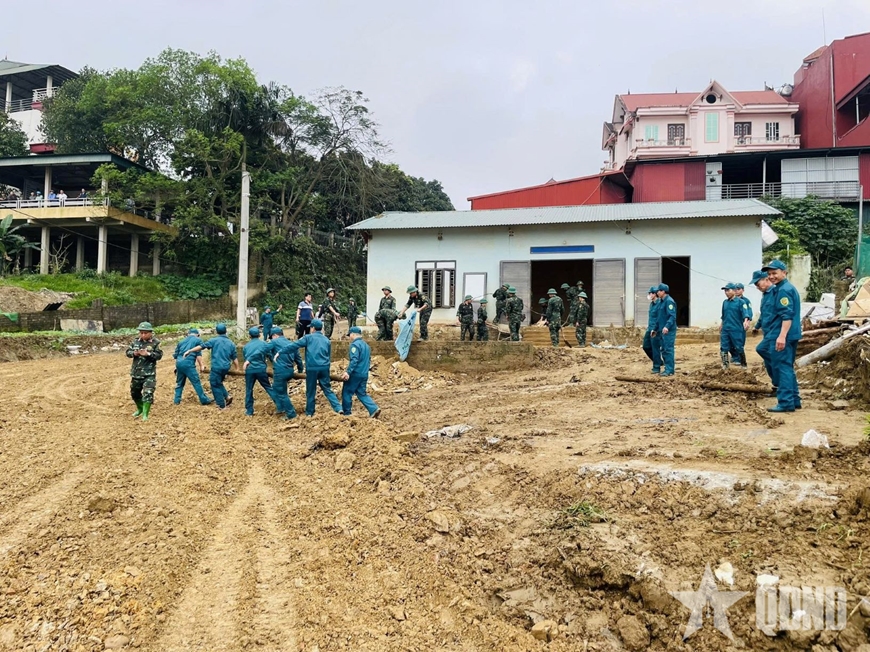 | Cán bộ, chiến sĩ Ban CHQS xã Đoan Hùng (Phú Thọ) phối hợp với các lực lượng chức năng dọn dẹp mặt bằng, bắc cầu phao phục vụ nhân dân. |