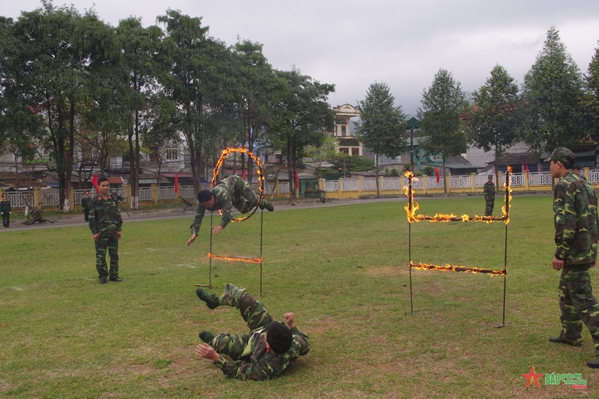 | Cán bộ, chiến sĩ Đại đội Trinh sát (Phòng Tham mưu, Bộ CHQS tỉnh Hòa Bình) luyện tập các thế võ đối kháng. |