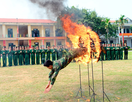 Huấn luyện vượt vòng lửa ở Lữ đoàn 144, Bộ Tổng tham mưu. Ảnh: Xuân Nho.