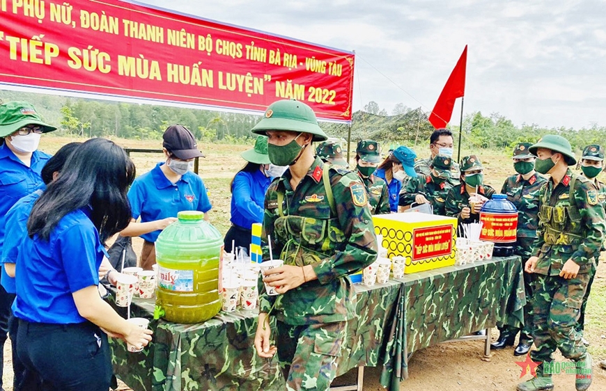 Đại úy QNCN Lê Thị Vân, Chủ tịch Hội Phụ nữ Bộ CHQS tỉnh Bà Rịa-Vũng Tàu cho biết: “Để có được những cốc nước mát cho chiến sĩ trên thao trường, mỗi hội viên, đoàn viên, thanh niên phải chọn mua nguyên liệu từ chiều hôm trước. Buổi tối, sau khi hoàn thành công việc gia đình, chị em tự tay nấu, pha chế, ướp lạnh để gần trưa hôm sau mang ra thao trường phục vụ từng cán bộ, chiến sĩ, động viên bộ đội huấn luyện tốt hơn”. Không chỉ phục vụ nước uống, hội viên, đoàn viên, thanh niên còn tổ chức giao lưu văn nghệ trong giờ giải lao, giúp chiến sĩ trẻ vơi đi mệt nhọc. Đại úy Lê Huy Phương, Chính trị viên Đại đội 5, Tiểu đoàn 500, bày tỏ: “Việc làm của các cô, các chị, các đoàn viên, thanh niên không chỉ thể hiện tình cảm, sự quan tâm, sẻ chia với chiến sĩ mà còn giúp cán bộ giáo dục bộ đội hiệu quả hơn, thuyết phục hơn nhờ những ví dụ thực tế sinh động về tình đồng chí, đồng đội trên thao trường”.