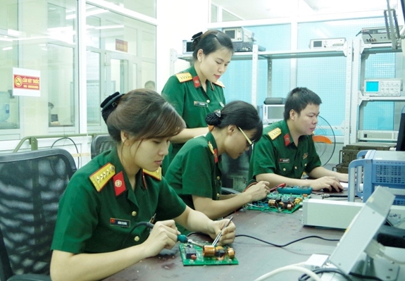 Cán bộ, kỹ sư Trung tâm Kỹ thuật Thông tin công nghệ cao nghiên cứu, sửa chữa trang thiết bị kỹ thuật. Ảnh: VĂN ĐẢNG