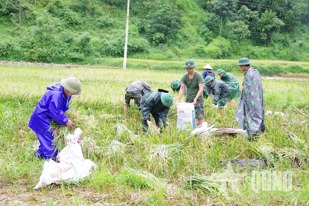 Cán bộ, chiến sĩ Tiểu đoàn 40 giúp nhân dân gặt lúa chạy bão. |