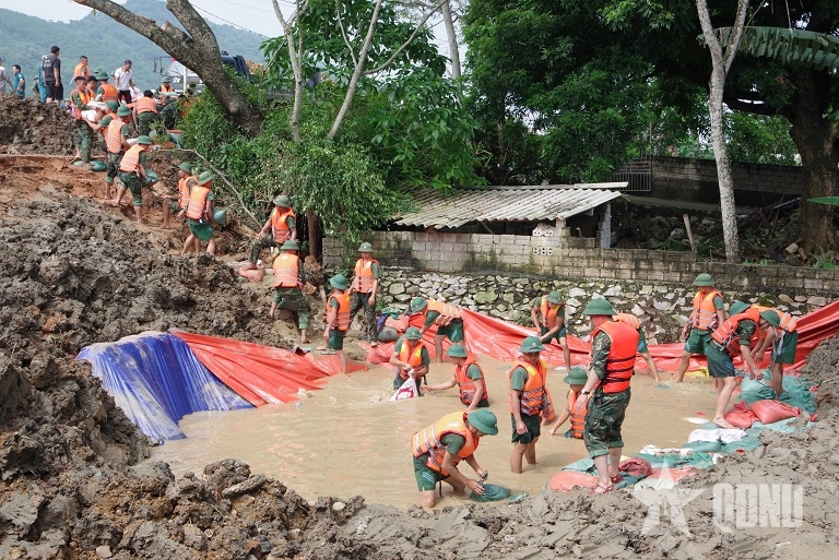 Tham gia giúp địa phương gia cố đê sạt lở. |