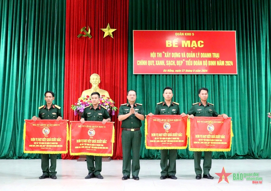 Tiểu đoàn 72, Trung đoàn 885 (thứ 2, từ phải sang) vinh dự được Quân khu 5 tặng cờ vì đạt kết quả xuất sắc tại hội thi “Xây dựng và quản lý doanh trại chính quy, xanh, sạch, đẹp” tiểu đoàn bộ binh cấp Quân khu năm 2024.