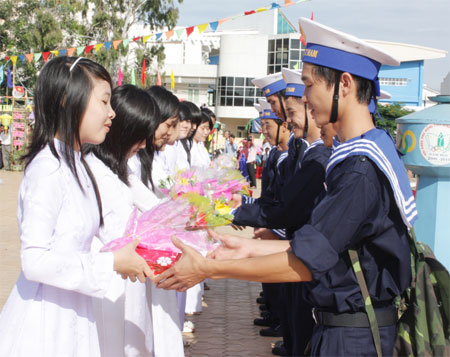 Thiếu nữ tỉnh Bình Thuận, tặng hoa thanh niên nhập ngũ vào Quân chủng Hải quân đợt 2-2013.