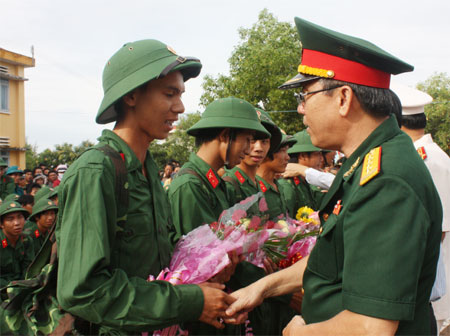Cán bộ Bộ CHQS tỉnh Bình Thuận động viên thanh niên lên đường nhập ngũ đợt 2-2013.