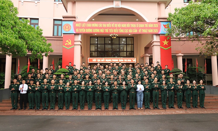 | Lãnh đạo Tổng cục Hậu cần-Kỹ thuật cùng đại diện các sĩ quan, gương mặt trẻ tiêu biểu trong Tổng cục năm 2025. |