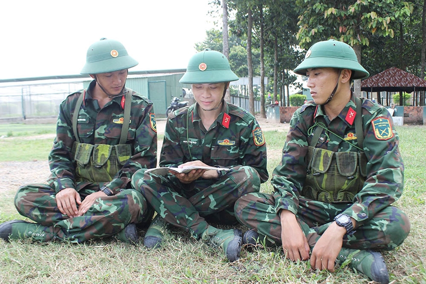 | Chiến sĩ mới Tiểu đoàn 10, Sư đoàn 317, Quân khu 7 sinh hoạt tổ ba người trên bãi tập trong giờ giải lao. |